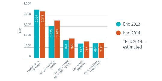 The worth of the UK’s stock of commercial property rose to £787 billion in 2014. The 15% increase over the year largely reflected a rise in property prices, driven by the willingness of investors to pay more for a given rent as the UK economy recovered and confidence returned. The stock of commercial property represents 10% of national net wealth. Privately rented residential property accounts for a further 12% of the UK’s net wealth.