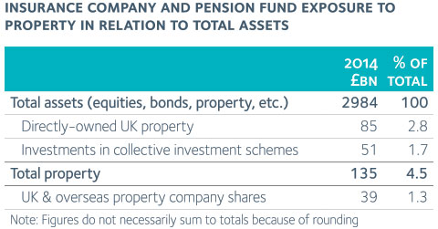 Property, in one form or another, accounts for around 6% of the £3 trillion in total invested by UK institutions (insurance companies and pension funds). Property’s share grew in 2014, mainly because values increased more rapidly than in other asset classes.