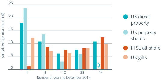 Property company shares delivered relatively high returns in 2014. The five-year record is also comparatively good, although property company shares tend to be much more volatile than directly-owned property and other asset classes.